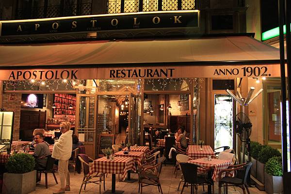 看到餐廳外頭寫著Apostolok 1902,是百年餐廳無誤。戶外的座位有爐火及現場大小提琴演奏著,帶有幾分浪漫,加上在外面推銷的服務生(應該是老闆娘吧)非常熱情的用英文一直跟我們介紹餐廳的歷史與當地的菜色等等.....心想應該很棒,就直接進去了!