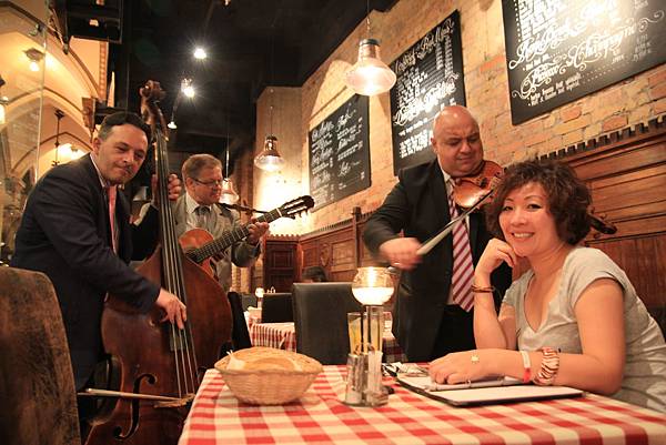 晚餐期間還有大小提琴演奏, 他們都會主動走過來餐桌旁邊一桌桌演奏索取小費(當然是自願性給的,但是他們一般會彈到客人給小費然後繼續推銷CD, 這一團是有點吉普賽音樂的,個人覺得他們可能覺得亞洲人很有錢因為在我們旁邊真的彈奏很久,加上我們又有拍照,不好意思之下,大衛便掏出小費500福林x 4個人 ........果然開始推銷我們CD,我們直說no, no, no...thank you!!